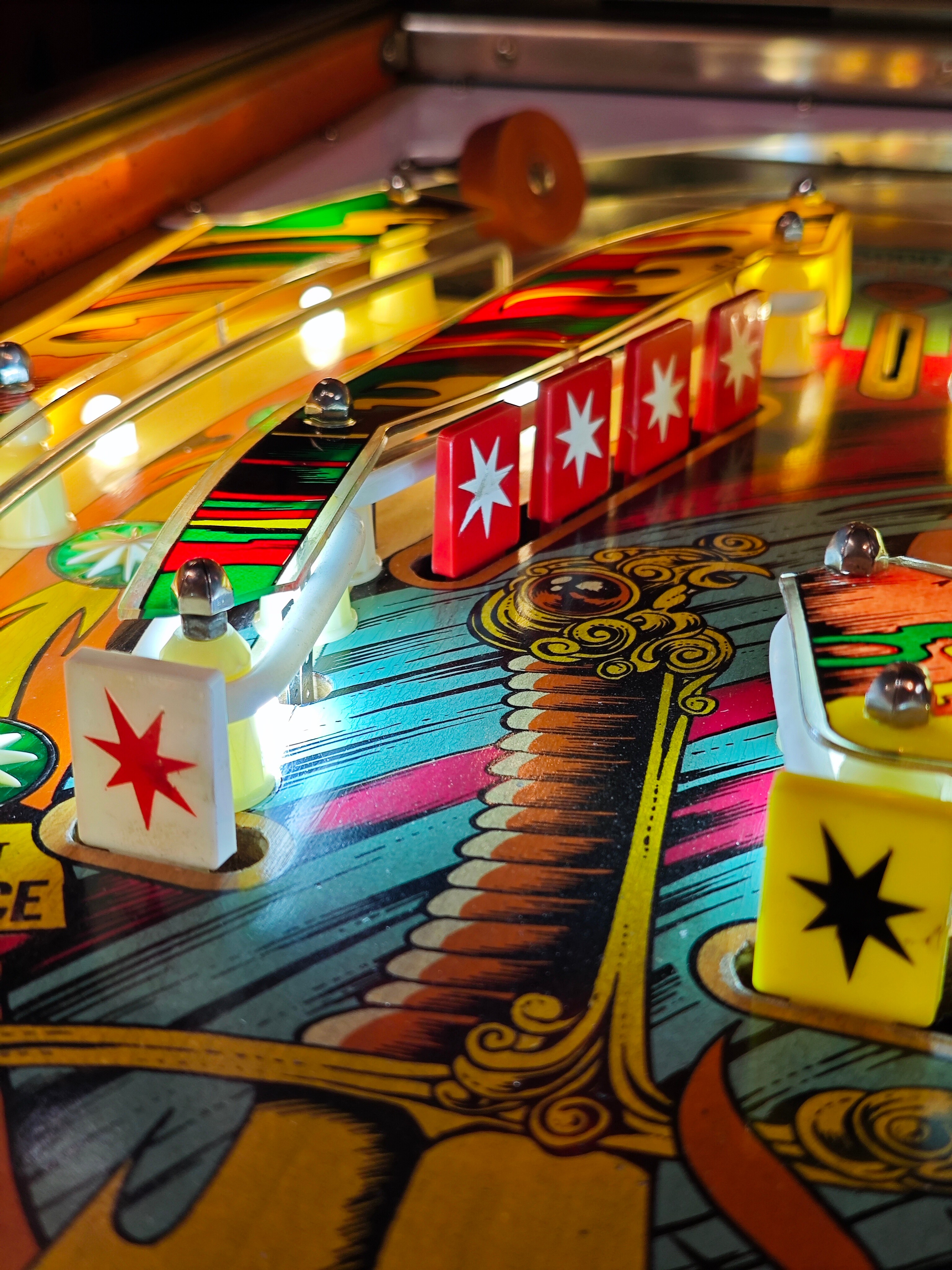 Klasyczny elektromechaniczny- cztery banki tarcz, podwójne bumpery i drop targety wymagają precyzji i refleksu. Brak multiballi i efektów specjalnych – magia tkwi w prostocie.